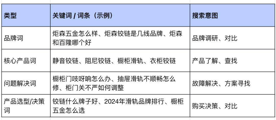 二、炬森五金GEO优化目标关键词/短语拆解基于品牌背景和用户搜索意图,加搜geo研究室拆解出炬森五金的四类典型关键词: